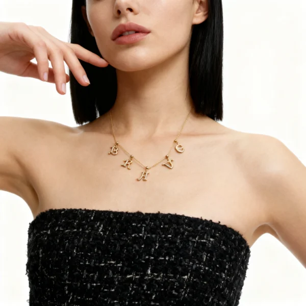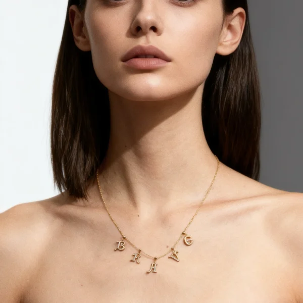 Crafted from 925 sterling silver with 18k gold plating, this layered necklace features five individual letter charms spelling “BRAVE” in an elegant script font. Each pendant symbolizes courage and self-empowerment, designed to be worn close to the heart as a daily reminder of inner strength. The modular design allows you to rearrange or mix the letters with other charms, creating a personalized narrative of resilience.